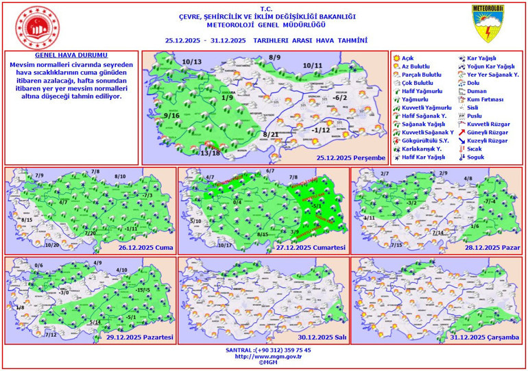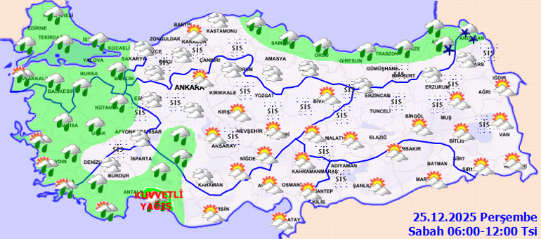Meteoroloji Genel Müdürlüğü, Türkiye genelinin genel olarak parçalı ve yer yer çok bulutlu olacağını, Marmara, Ege, Batı Akdeniz, İç Anadolu’nun güney ve batısı, Orta ve Doğu Karadeniz kıyıları ile Zonguldak, Düzce, Bolu ve Sinop çevreleri ile Kastamonu'nun kıyı ve Mersin'in batı kesimlerinin yağmur ve sağanak, Artvin ve Ardahan çevrelerinin ise karla karışık yağmur ve kar yağışlı geçeceğini tahmin ediyor. Yağışların Antalya’nın doğusunda yer yer kuvvetli olması beklenirken, kuzey, iç ve doğu kesimlerde yer yer sis ve pus hadisesi yaşanabilir.