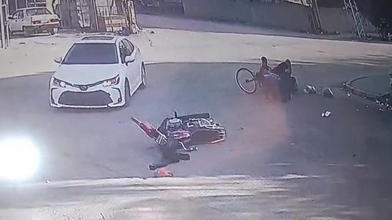 Savrulan motosikletin sürücüsü, kaldırımda yürüyen yaşlı bir çiftin üzerine düştü. Anbean güvenlik kamerasına yansıyan bu kaza, motosikletin üzerindeki iki şahıs ile kaldırımda yürüyen çifti hafif şekilde yaraladı.