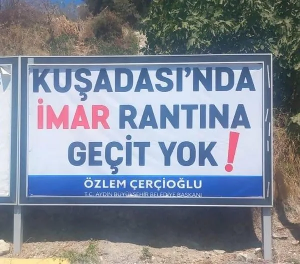 CHP'den ayrılarak AK Parti'ye katılan Aydın Büyükşehir Belediye Başkanı Özlem Çerçioğlu, 14 Ağustos'ta Ankara'da düzenlenen bir törende rozeti takılmasının ardından, Kuşadası Belediye Başkanı Ömer Günel'e billboardlarda asılı olan mesajlar aracılığıyla göndermede bulundu. “Ben milyarlarca lira imar rantına geçit vermediğim için anti demokratik uygulamalara maruz kaldım. Ama Kuşadası'nda bu ranta geçit vermeyeceğim” ifadelerini kullanarak, ilçedeki imar rantına dikkat çekti. Çerçioğlu, Kuşadası'nda 'Kuşadası'nda imar rantına geçit yok' yazılı afişler asarak bu konudaki hassasiyetini vurguladı. Ayrıca, CHP Genel Başkanı Özgür Özel'in Aydın mitingi öncesinde de Aydın Büyükşehir Belediyesi binasına “İmar rantına geçit yok” şeklinde pankartlar astırdığı biliniyor. Çerçioğlu, CHP içindeki imar rantı için kendisine uygulanan baskıları da dile getirmişti.