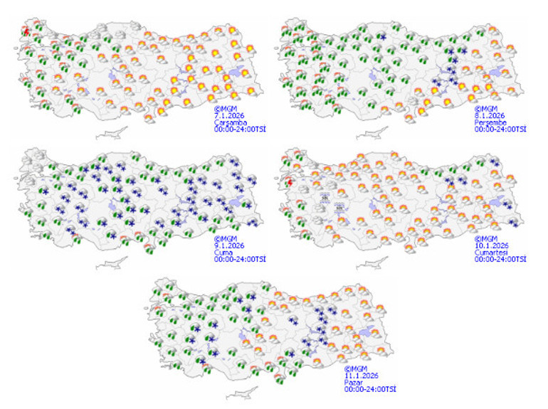 Meteoroloji Genel Müdürlüğü’nün 8 Ocak Perşembe tarihli tahminlerine göre Marmara, Ege, Batı ve Orta Karadeniz ile İç Anadolu’nun kuzey ve batı kesimlerinde sağanak yağışlar bekleniyor. Hava sıcaklıklarında ani düşüşler gerçekleşecek. İstanbul'da sıcaklıklar 8-10 derece azalacak, beraberinde fırtına ile güçlü sağanak yağışlar öngörülüyor.