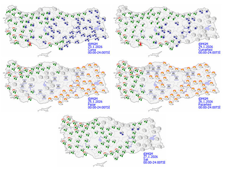 Son değerlendirmelere göre; Marmara’nın batısı, Kıyı Ege, Antalya, Hatay ve Osmaniye'de kuvvetli yağmur ve sağanak, Güneydoğu Anadolu ile Sivas, Kayseri, Yozgat, Nevşehir, Elazığ, Tunceli, Bitlis, Bingöl, Malatya ve Kahramanmaraş çevrelerinde kuvvetli kar yağışı beklendiğinden, olumsuzluklara karşı dikkatli olunması önem arz ediyor.