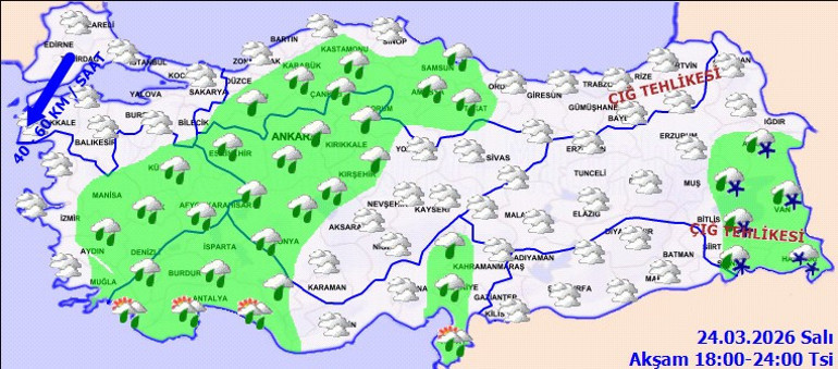 Yağışların genelde yağmur ve sağanak, Batı Karadeniz’in iç kesimlerinin yüksekleri ile Doğu Anadolu'nun doğusunda karla karışık yağmur ve kar şeklinde olması bekleniyor. Yağışların Antalya’nın merkez ve doğusunda kuvvetli olması öngörülüyor.