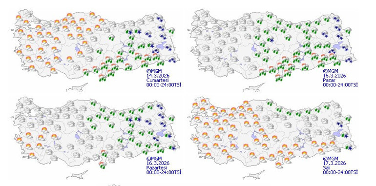 Meteoroloji Genel Müdürlüğü, ülkemiz genelinin parçalı ve çok bulutlu, Doğu Akdeniz, İç Anadolu’nun doğusu, Doğu Karadeniz'in iç kesimleri, Doğu ve Güneydoğu Anadolu ile Tokat çevrelerinin yağışlı geçeceğini açıkladı.
