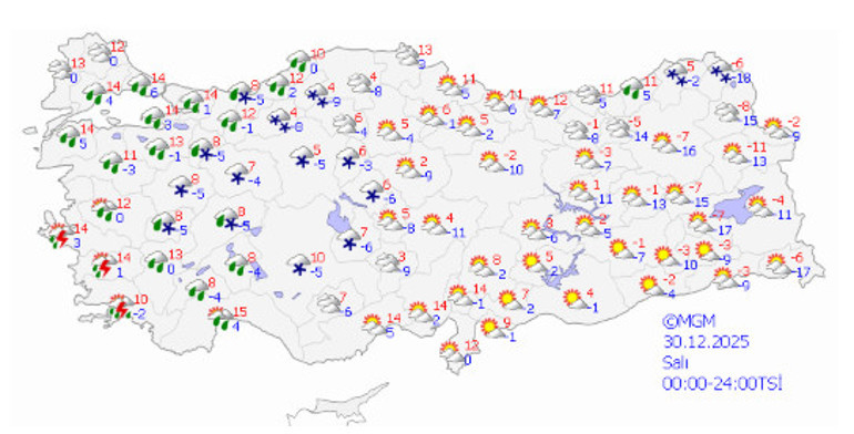 Parçalı ve çok bulutlu, akşam saatlerinden itibaren karla karışık yağmur ve kar yağışlı. Buzlanma ve don ile birlikte pus, yer yer sis bekleniyor.