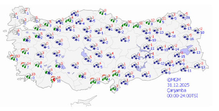 Meteoroloji Genel Müdürlüğü, Aydın ve Muğla için sarı kod uyarısı yayımladı. Bilecik, Kütahya, Karabük, Bolu, Eskişehir, Uşak, Konya, Kırşehir, Kırıkkale, Ankara, Aksaray, Artvin, Afyonkarahisar ve Ardahan illerinde kar yağışı bekleniyor. Haftanın ortasında, çarşamba günü ülke genelinde kar yağışlarının etkisini artıracağı öngörülüyor.