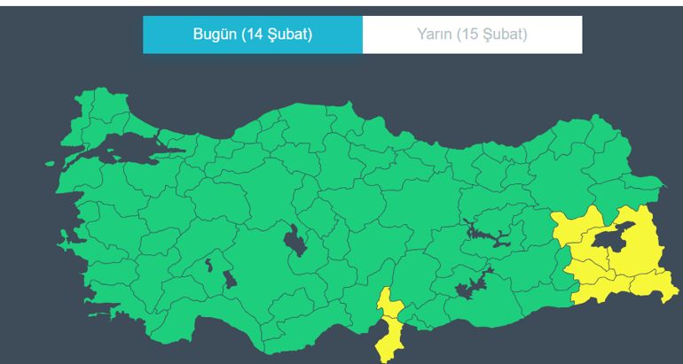 Bitlis, Hakkari, Hatay, Muş, Siirt, Van, Şırnak ve Osmaniye için sarı kodlu meteorolojik uyarı yapılmıştır.