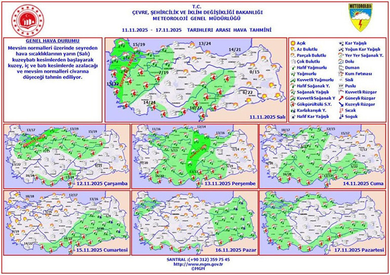 Meteoroloji Genel Müdürlüğü'nün tahminlerine göre, ülke genelinin parçalı ve yer yer çok bulutlu seyredeceği, Marmara, Ege ve Doğu Akdeniz bölgelerinde sağanak ve gök gürültülü sağanak yağışların etkili olacağı öngörülüyor. Mevsim normallerinin üzerinde seyreden sıcaklıkların yağışlarla birlikte kuzeybatı kesimlerinden başlayarak düşmesi bekleniyor; kuzey, iç ve batı bölgelerinde ise mevsim normalleri civarına inmesi tahmin ediliyor. Rüzgarların genel olarak güney yönünden, Akdeniz ve Güneydoğu Anadolu'da ise kuzey yönünden hafif ve zaman zaman orta kuvvette eseceği belirtiliyor.