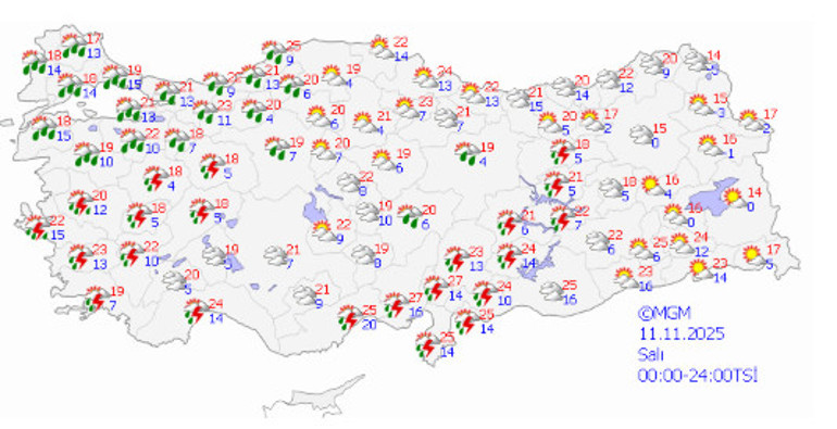 Meteoroloji Genel Müdürlüğü'nün tahminlerine göre, ülke genelinin parçalı ve yer yer çok bulutlu seyredeceği, Marmara, Ege ve Doğu Akdeniz bölgelerinde sağanak ve gök gürültülü sağanak yağışların etkili olacağı öngörülüyor. Mevsim normallerinin üzerinde seyreden sıcaklıkların yağışlarla birlikte kuzeybatı kesimlerinden başlayarak düşmesi bekleniyor; kuzey, iç ve batı bölgelerinde ise mevsim normalleri civarına inmesi tahmin ediliyor. Rüzgarların genel olarak güney yönünden, Akdeniz ve Güneydoğu Anadolu'da ise kuzey yönünden hafif ve zaman zaman orta kuvvette eseceği belirtiliyor.