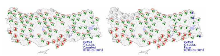 Meteoroloji Genel Müdürlüğü hava sıcaklıklarının ülkemiz genelinde mevsim normalleri civarında seyredeceği, rüzgarın ise genellikle güneyli yönlerden hafif, ara sıra orta kuvvette, Kıyı Ege ve Doğu Akdeniz'de kuvvetli (40-60 km/saat) esmesi bekleniyor. Sağanak yağışların öğleden sonra tüm yurtta etkisini artırması öngörülüyor.