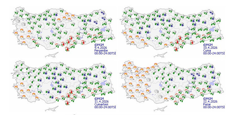 Yağışların genellikle yağmur ve sağanak, Güneydoğu Anadolu'da yer yer gök gürültülü sağanak şeklinde olması bekleniyor. Doğu Karadeniz'in iç kesimleri, Doğu Anadolu'nun kuzey ve doğusu ile öğle saatlerinden itibaren Batı Karadeniz'in iç kesimleri ile gece saatlerinde İç Anadolu'nun doğusunda karla karışık yağmur ve yer yer kar görülmesi öngörülüyor.
