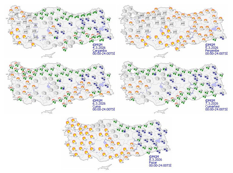 İç ve doğu kesimlerde hava sıcaklıklarının 2 ila 4 derece azalacağı, diğer bölgelerde ise önemli bir değişiklik olmayacağı tahmin ediliyor. Rüzgarın, genellikle kuzey yönlerden hafif, ara sıra orta kuvvette, ayrıca Akdeniz’in iç kesimleri, İç Anadolu’nun güneyi, Doğu ve Güneydoğu Anadolu’nun batısında kuvvetli (40-60 km/saat) olarak esmesi bekleniyor. Meteoroloji Genel Müdürlüğü tarafından yayımlanan yeni haritaya göre, Cuma günü başlayacak olan sağanak ve kar yağışları hafta sonu da etkisini sürdürecek.
