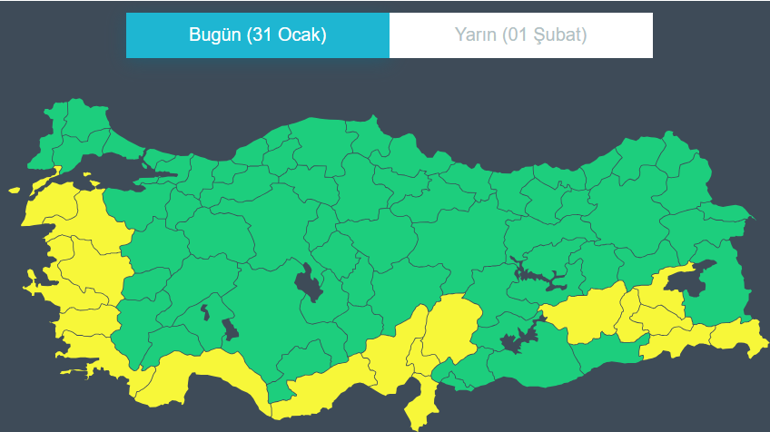 Adana, Antalya, Aydın, Balıkesir, Bitlis, Çanakkale, Diyarbakır, Hakkari, Hatay, Mersin, İzmir, Manisa, Kahramanmaraş, Muğla, Osmaniye, Siirt, Batman ve Şırnak illeri için sarı kodlu meteorolojik uyarı yapılmıştır.