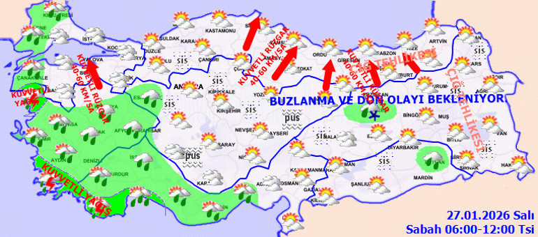 Yağışların Kıyı Ege, Batı Akdeniz kıyıları, Doğu Akdeniz ile Adıyaman, Gaziantep ve Kilis çevrelerinde kuvvetli olacağı öngörülüyor. Bu sabah ve gece saatlerinde iç ve doğu bölgelerde buzlanma, don, pus ve yer yer sis olaylarının meydana geleceği tahmin ediliyor. Doğu Karadeniz'in iç kesimlerinin yüksek kesimlerinde ve Doğu Anadolu'nun doğusunda yüksek kar örtüsüne sahip eğimli bölgelerde çığ tehlikesi bulunmaktadır.