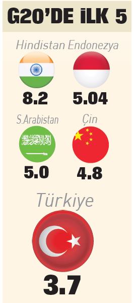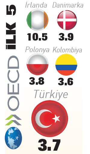 Türkiye, Ekonomik İşbirliği ve Kalkınma Örgütü (OECD) ülkeleri arasında en hızlı büyüyen 4'üncü ülke konumuna geldi. Yüzde 10.5 büyümeyle İrlanda ve yüzde 3.9 ile Danimarka, OECD'nin ilk iki sırasını alırken; Türkiye, G20 ülkeleri arasında da yüzde 3.7 büyüme ile 5’inci sırada yer aldı. G20 ülkeleri arasında, üçüncü çeyrekte en hızlı büyüme gösteren ülke yüzde 8.2 ile Hindistan oldu.