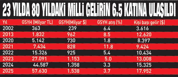 İlk dokuz aydaki yıllık büyüme oranı yüzde 3.7 olarak kaydedilirken, bir önceki çeyreğe göre büyüme ise yüzde 1.1 oldu. Toplam Gayri Safi Yurt İçi Hasıla (GSYH), yıllık bazda 1 trilyon 538 milyar dolara ulaşırken, kişi başına düşen gelir 17 bin 952 dolar olarak belirlendi. 2002 yılında 239 milyar dolar olan GSYH, son 23 yılda 6.5 kat artış gösterdi.