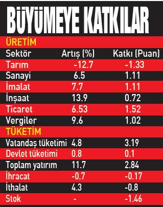 Yatırımlar, bu çeyrekte yüzde 11.7 oranında büyüyerek ekonomiye 2.84 puanlık yukarı yönlü katkı sağladı. Makine ve teçhizat yatırımları da cari fiyatlarla yüzde 11.3 büyüme gösterdi. Ancak zirai don ve kuraklığın etkisiyle tarım sektörü yüzde 12.7 daralma yaşadı ve bu durum ekonominin büyümesini 1.33 puan aşağı çekti.