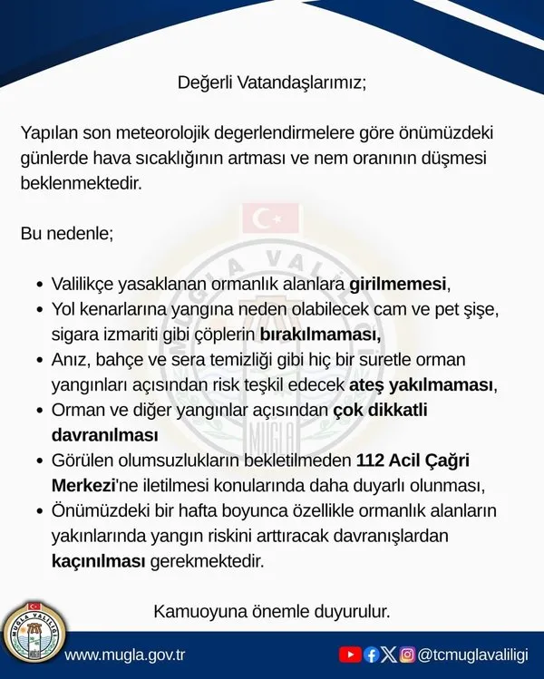 Muğla Valiliğinden Orman Yangını Riski Uyarısı