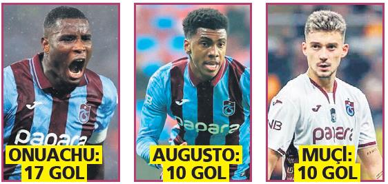 Trabzonspor'un hücum serisini oluşturan ileri üçlü, bu sezon göz kamaştırıcı bir performans sergiliyor. Geride kaldığımız haftada Gaziantep FK karşısında 3 dakikada fişini çeken Paul Onuachu (1 gol), Felipe Augusto (1 gol) ve Ernest Muçi (1 asist), bordo-mavililerin başarılı gidişatında önemli bir rol üstleniyor. Teknik direktör Fatih Tekke'nin vazgeçilmezleri olan bu muhteşem üçlü, Fırtına'nın zirve hedefinin baş aktörleri oldu. Onuachu, 17 kez fileleri sarsarken, Augusto ve Ernest Muçi, 10'ar golle toplamda 37 gol atarak Avrupa'nın liglerinde en çok gol atan üçüncülüğe yerleşti. Trabzonspor, yalnızca Bayern Münih çiftlisi Kane-Diaz-Olise'nin (51 gol) gerisinde kaldı.
