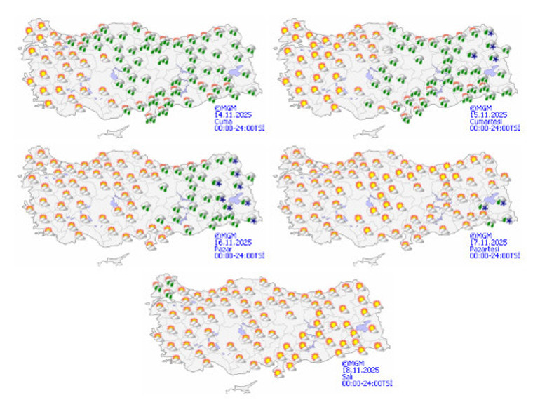 Yağışların öğle saatlerinden itibaren başlaması ve hafta sonu boyunca devam etmesi öngörülürken, ülke genelinin parçalı ve çok bulutlu, Marmara’nın doğusu, Doğu Akdeniz, İç Anadolu’nun doğusu, Karadeniz, Doğu Anadolu'nun kuzey ve batısı ile Güneydoğu Anadolu'nun çevrelerinde yağmur ve sağanak yağış bekleniyor. Doğu Karadeniz’in yüksek kesimlerinde ise karla karışık yağmur ve yer yer kar yağışı görülecek.