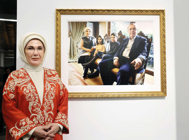 Fotoğraf sanatçısı Ara Güler’in eserleri hakkında bilgi alan Emine Erdoğan, Cumhurbaşkanı Erdoğan ve torunlarıyla birlikte yer aldığı bir fotoğrafın önünde poz verdi.