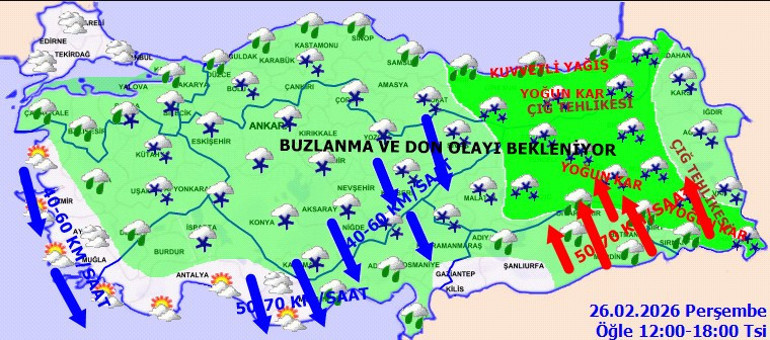 Meteoroloji Genel Müdürlüğü, öğle saatlerinden itibaren Hakkari çevreleri, Şırnak'ın doğusu ve Van'ın güney kesimlerinde beklenen yağışların kuvvetli, yer yer çok kuvvetli, yüksek kesimlerde ise yoğun kar olarak devam edeceği tahmin ediliyor.