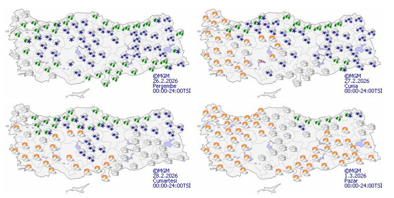 Meteoroloji Genel Müdürlüğü tarafından yapılan değerlendirmelerde, ülke genelinin parçalı ve çok bulutlu geçeceği, Ege kıyıları ile Antalya ve Edirne çevreleri dışında aralıklı yağış beklendiği aktarıldı. Yağışların; Doğu Akdeniz, Karadeniz kıyıları, Güneydoğu Anadolu, Kocaeli, Yalova, Sakarya, Manisa ve Denizli çevrelerinde yağmur ve sağanak, diğer bölgelerde ise karla karışık yağmur ve kar şeklinde olması öngörülüyor.