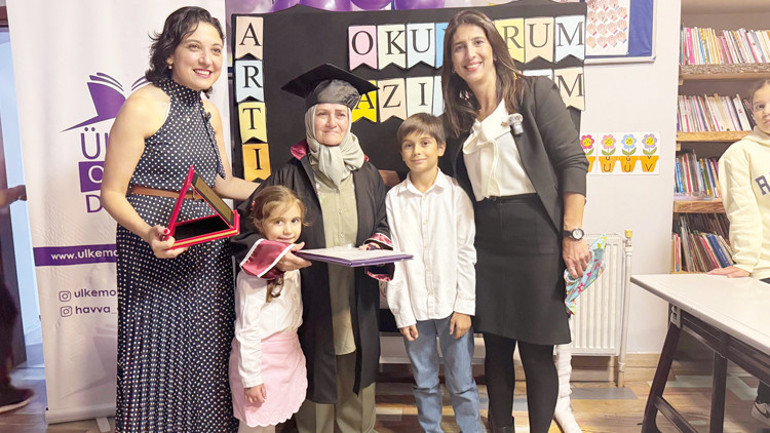 6 Şubat depremlerinin ardından bölgede eğitim odaklı çalışmalarıyla tanınan Ülkem Okuyor Derneği Başkanı Havva Aydanur Ertuğrul, “Derneğimizin gönüllülerinden Ahu Hocamızın Hayat Boyu Öğrenme Genel Müdürlüğü’ne yaptığı başvuruyla İstanbul Sarıyer’de okuma yazma bilmeyen 40 yaş üzeri kadınlar için bir kurs açtık. Ahu öğretmenin çevresindeki okuma yazma bilmeyen kadınları tespit ettik. Bazıları gündüz evlere temizliğe gittikten sonra akşamları kursa katıldılar. Üç ay sonunda okuma yazmayı başardılar. Ardından mezuniyet töreni düzenledik. 8 kadın öğrencimiz için okur yazarlık sertifikaları geldi ve cübbe giyip, kep attılar. Onlara kitaplar hediye ettik ve bu hediyelerimiz devam edecek. Ayrıca okuma grubumuza da katıldılar. Dernek olarak ‘Türkiye’de okumayan kalmasın’ diyerek çıktığımız bu yolda, onların mezuniyeti bizim için büyük bir başarıyı simgeliyor” dedi.