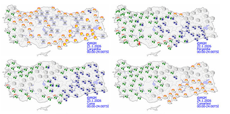 Meteoroloji Genel Müdürlüğü tarafından yapılan açıklamalara göre, ülke genelinde parçalı ve yer yer çok bulutlu bir hava bekleniyor. Özellikle Marmara'nın batısı, Kıyı Ege, Manisa ve Antalya'nın çevrelerinde yağmur ve sağanak yağış olacağı, gece saatlerinde ise Karaman çevreleri ile Antalya'nın batısının iç ve yüksek kesimlerinde karla karışık yağmur ve kar yağışının etkili olacağı öngörülüyor. Sabah ve gece saatlerinde, Marmara'nın doğusu ve iç doğu bölgelerde buzlanma, don olayı, pus ve yer yer sis beklenmekte. Doğu Karadeniz’in iç kesimlerinin yüksekleri ile Doğu Anadolu’nun doğusunda çığ tehlikesi mevcut.