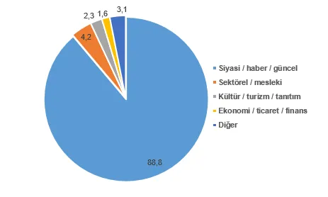 Toplam 2 bin 40 süreli yayının yüzde 88,8'i siyasi/haber/güncel, yüzde 4,2'si sektörel/mesleki, yüzde 2,3'ü kültür/turizm/tanıtım, yüzde 1,6'sı ekonomi/ticaret/finans içerikli yayımlanırken, yüzde 3,1'i ise diğer içerik türlerinden yayımlanmıştır.
