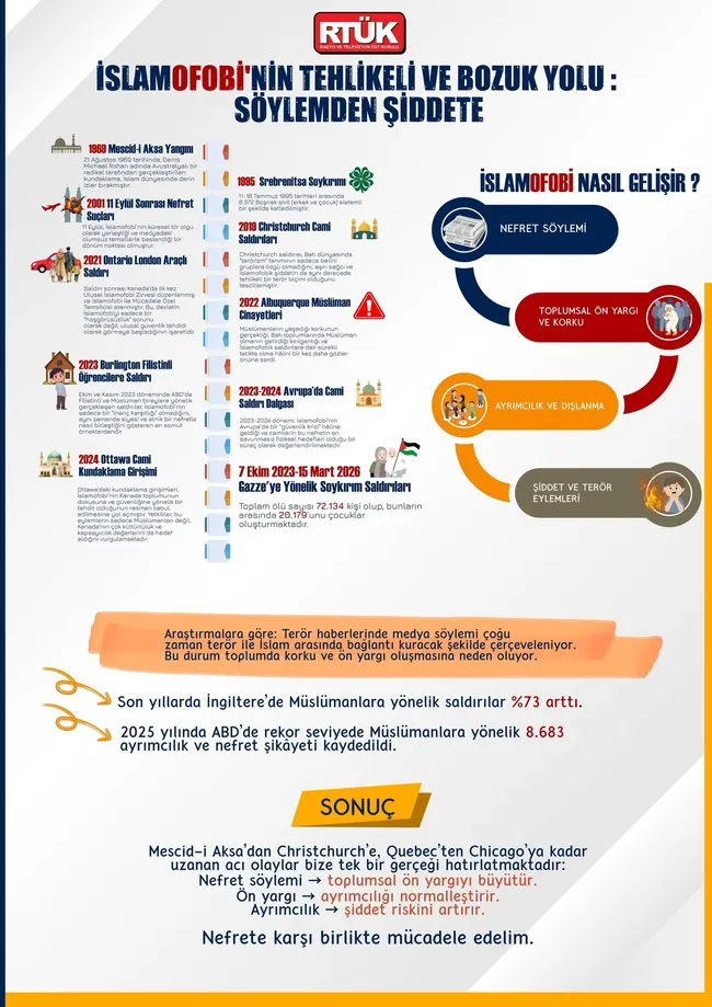 Bu vesileyle Radyo ve Televizyon Üst Kurulu olarak; ayrımcılığa, nefret söylemine ve ötekileştirici yaklaşımlara karşı sorumlu yayıncılık anlayışının güçlendirilmesi yönündeki çalışmalarımızı kararlılıkla sürdüreceğimizi kamuoyuna saygıyla bildiririz.”