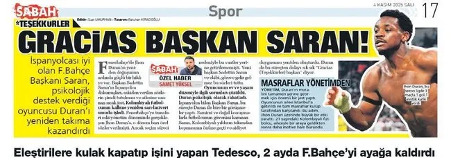 Beşiktaş karşılaşmasında 66. dakikada oyuna dahil olan ve 83'te kendi çabasıyla galibiyet golünü kaydeden Jhon Duran, dün gerçekleştirilen antrenmanda basın mensuplarının sorularını yanıtladı. SABAH Spor'un “GRACIAS (TEŞEKKÜRLER) BAŞKAN SARAN” başlıklı manşetinde, iyileşme sürecinde Sadettin Saran'ın rolü vurgulandı. Duran, “Uzun bir sakatlıktı. Her futbolcu takımına katkı sağlamak ve bir an önce oynamak ister. Başkanımız, tüm sakatlık sürecim boyunca yanımda oldu, bana destek sağladı. Benimle sürekli iletişim halindeydi. Bu süreci atlatmamda en büyük yardımcımdı.” şeklinde konuştu.