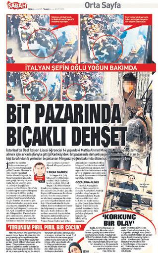 Sabah Gazetesi İstihbarat Şefi Erdoğan Yapık, gazetemizin 27 Ocak'ta manşetten verdiği 'Bit Pazarında Vahşet' başlıklı haberiyle 'Gazetecilik Övgü' kategorisinde ödül aldı. İstanbul Kadıköy'de bıçaklı saldırıda yaşamını yitiren 15 yaşındaki Mattia Ahmet Minguzzi'nin uğradığı saldırı, bu haberle birlikte ilk kez kamuya ulaştı ve büyük yankı buldu. SABAH