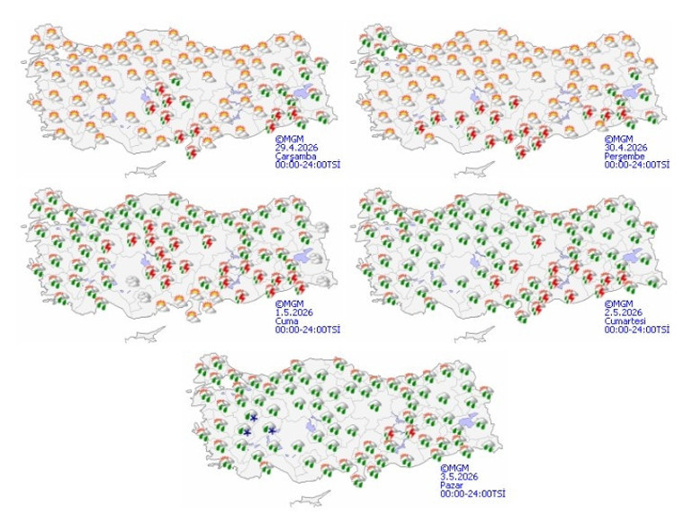 Meteoroloji Genel Müdürlüğü tarafından yapılan son değerlendirmelere göre: Ülkemiz genelinin parçalı ve çok bulutlu, Doğu Anadolu’nun doğusu (Ardahan ve Iğdır hariç), Antalya’nın iç kesimleri, Isparta'nın doğusu, Mersin'in iç kesimleri, Adana ve Osmaniye çevreleri, Kahramanmaraş'ın batısı, Kastamonu'nun güneyi, Çankırı'nın doğusu, Çorum'un batısı, Yozgat, Nevşehir, Kayseri, Niğde, Bingöl, Batman, Siirt ve Mardin çevreleri, Diyarbakır'ın doğusunun sağanak ve yer yer gök gürültülü sağanak yağışlı geçeceği tahmin ediliyor.