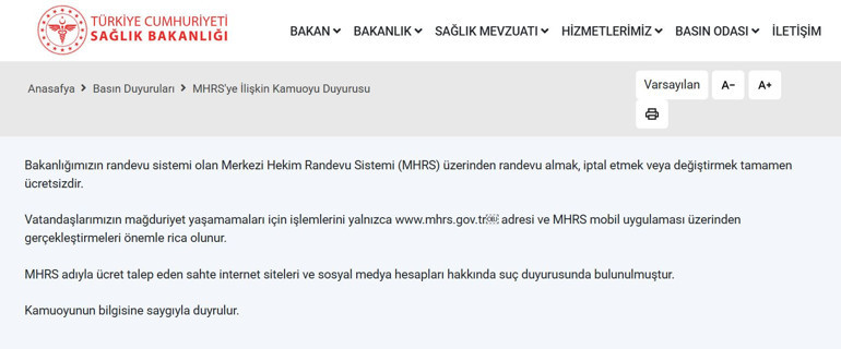 Bakanlıktan yapılan yazılı açıklamada, “Bakanlığımızın randevu sistemi olan Merkezi Hekim Randevu Sistemi (MHRS) üzerinden randevu almak, iptal etmek veya değiştirmek tamamen ücretsizdir. Vatandaşlarımızın mağduriyet yaşamamaları için işlemlerini yalnızca 'www.mhrs.gov.tr' adresi ve MHRS mobil uygulaması üzerinden gerçekleştirmeleri önemle rica olunur. MHRS adıyla ücret talep eden sahte internet siteleri ve sosyal medya hesapları hakkında suç duyurusunda bulunulmuştur. Kamuoyunun bilgisine saygıyla duyurulur.” denildi.