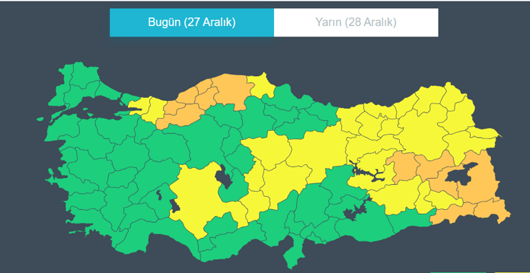 Sarı kodlu uyarı verilen iller ise şu şekildedir: Ağrı, Artvin, Diyarbakır, Elazığ, Erzincan, Erzurum, Giresun, Gümüşhane, Kars, Kayseri, Kocaeli, Konya, Nevşehir, Niğde, Rize, Sakarya, Siirt, Sinop, Sivas, Trabzon, Tunceli, Yozgat, Bayburt, Batman, Ardahan ve Iğdır.