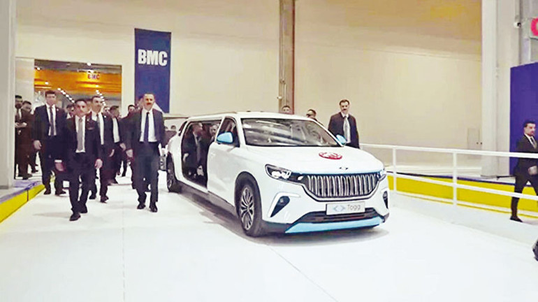Cumhurbaşkanı Erdoğan, Altay’ın üretim tesislerini, üzerinde Cumhurbaşkanlığı forsu bulunan özel üretim TOGG ile gezdi. TOGG’un direksiyonuna geçen BMC Yönetim Kurulu Başkanı Fuat Tosyalı, Erdoğan’a eşlik etti. Araç içindeki diğer isimler arasında Dışişleri Bakanı Hakan Fidan, Milli Savunma Bakanı Yaşar Güler ve Katar Başbakan Yardımcısı ve Savunma Bakanı Al Sani de yer aldı.