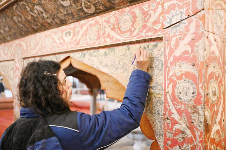 – Ana mekân ile revaklı avlu kubbelerindeki kalem işi ve alçı süsleme onarımları tamamlanmışken, haziredeki çalışmalar devam ediyor.