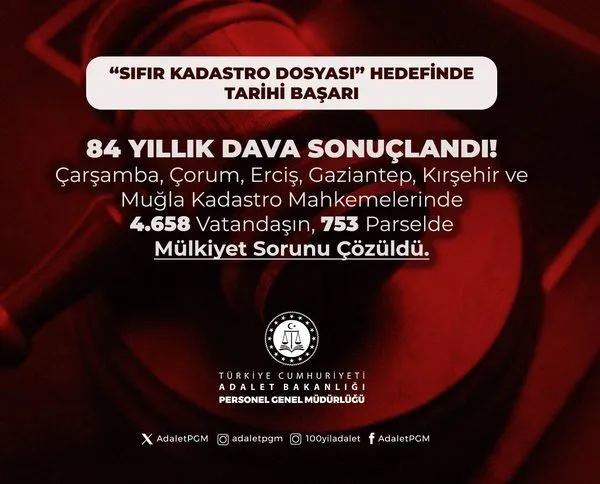 Adalet Bakanlığı, 2024 yılı sonunda başlattığı “Sıfır Kadastro Dosyası” projesi ile Türkiye genelinde uzun yıllardır devam eden kadastro davalarının sonuçlanmasına öncülük etti. Bu proje sayesinde, vatandaşların mülkiyet belirsizlikleri artık sona eriyor.