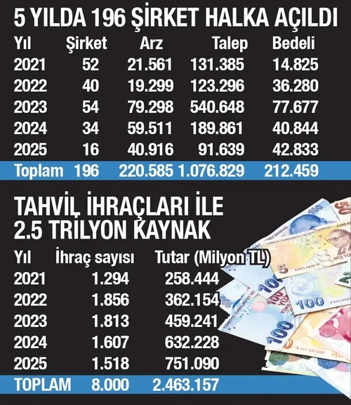 Borsa İstanbul'da 2021 yılından bu yana 196 şirket halka açıldı. Bu halka arzlardan elde edilen toplam kaynak ise 220 milyar 585 milyon TL olarak kaydedildi. Halka arzlara gelen talep, 1.1 trilyon TL'ye ulaştı. 2020 yılından beri bedelli sermaye artırımları ve ikincil halka arzlarla sağlanan kaynak ise 212 milyar 459 milyon TL oldu. Böylece, son 5 yılda halka arz ve sermaye artırımları yoluyla sağlanan toplam kaynak 433.1 milyar TL’ye ulaştı.