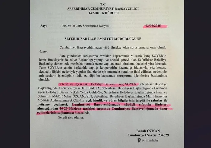 Tunç Soyer'in Seferihisar Belediye Başkanı iken eşinin Yönetim Kurulu Başkanı olduğu Hıdırlık Tarımsal Kalkınma Kooperatifi’ne 6.593,23 m² yüzölçümlü taşınmazı vermesi üzerine şikayet edildiği, başlatılan soruşturma kapsamında 16-20 Haziran tarihleri arasında Soyer'in ifadeye çağrıldığı ancak gitmediği öğrenildi. Dosya, bugün itibarıyla Seferihisar Cumhuriyet Başsavcılığından İzmir Cumhuriyet Başsavcılığına intikal ettirildi.