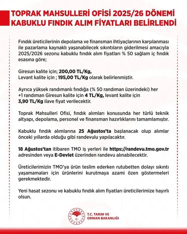 Fındık alım fiyatları netleşti. Giresun kalite fındığın kilogramı için 200 TL ödeme yapılacak.