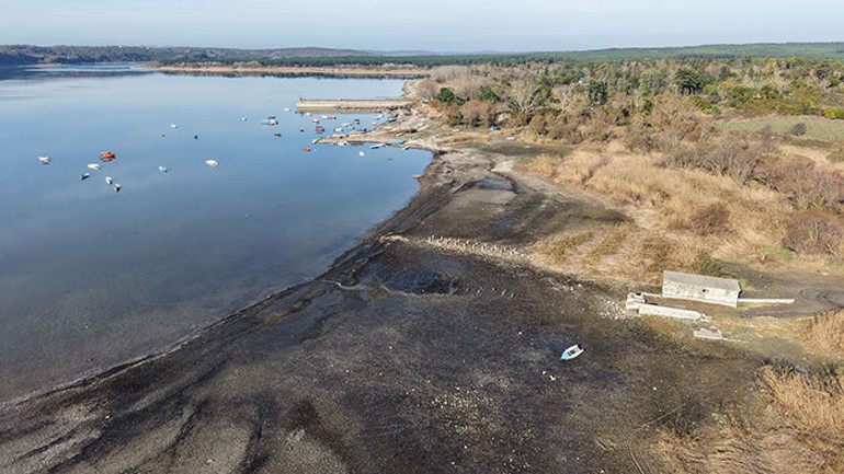 İstanbul’un en büyük barajlarından biri olan Terkos Baraj Gölü'nde de doluluk oranı yüzde 19.01’e kadar geriledi. Baraj havzasında daha önce suyla kaplı olan alanların kuruduğu, bazı teknelerin ise demir attıkları noktadan onlarca metre uzakta, balçık çamur içinde kaldığı görüldü. Bölgedeki son durum havadan görüntülendi.