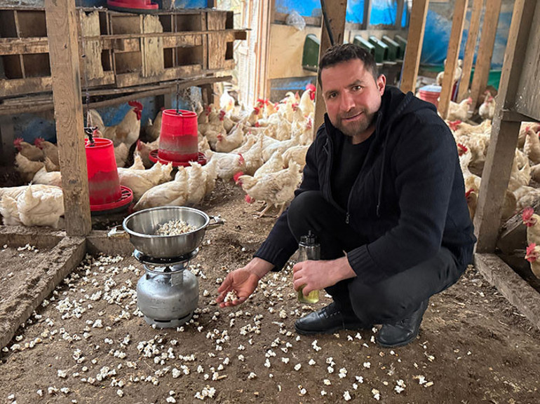 Perşembe ilçesindeki Kutluca Mahallesi'nde 15 yıldır organik yumurta üreten İhsan Tanrıvermiş, kış aylarında tavuklarının dışarı çıkamamaları yüzünden stres yaşadıklarını ve yumurta sayısının azaldığını fark etti. Bu sorunu çözmek için farklı yöntemler araştıran Tanrıvermiş, sosyal medyada izlediği bir videodan ilham alarak tavuklarını mutlu etmek amacıyla mısır patlatmayı denemeye karar verdi.