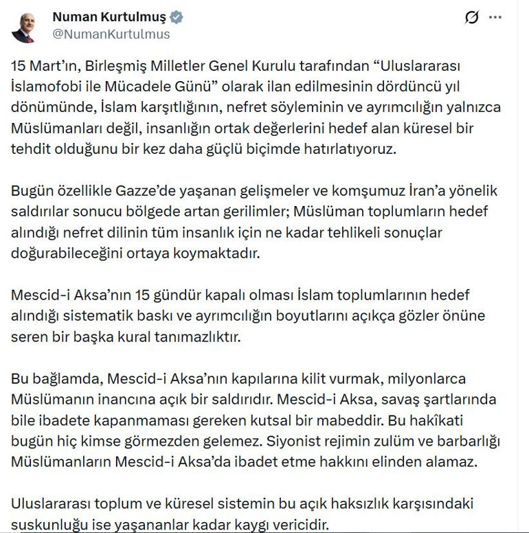Numan Kurtulmuş , ” Mescid-i Aksa ’nın kapılarına kilit vurmak, milyonlarca Müslümanın inancına açık bir saldırıdır. Mescid-i Aksa, savaş şartlarında bile ibadete kapanmaması gereken kutsal bir mabettir. Bu hakikati bugün hiç kimse görmezden gelemez. Siyonist rejimin zulüm ve barbarlığı Müslümanların Mescid-i Aksa'da ibadet etme hakkını elinden alamaz. Uluslararası toplum ve küresel sistemin bu açık haksızlık karşısındaki suskunluğu ise yaşananlar kadar kaygı vericidir. '15 Mart Uluslararası İslamofobi ile Mücadele Günü' vesilesiyle, Müslümanları hedef alan her türlü ön yargının, ayrımcılık ve düşmanlığın son bulduğu; farklılıkların zenginlik olarak görüldüğü daha adil ve barışçıl bir dünya özlemini bir kez daha güçlü biçimde vurguluyoruz” dedi.
