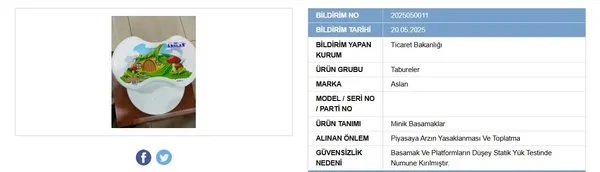 Bakanlık, 20 Mayıs’ta yayımladığı bir diğer duyuruda “Aslan” markalı taburenin düşey statik yük testinde kırıldığı, bu sebepten ötürü de kullanım açısından risk oluşturduğu belirtildi.