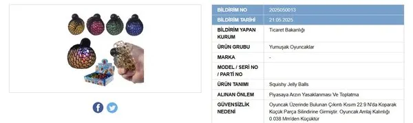 Bakanlığın 21 Mayıs’ta duyurduğu bilgilendirme metninde, yumuşak oyuncaklar kategorisinde bulunan bir ürünle ilgili olarak “Oyuncak üzerindeki çıkıntı kısmı 22.9 N kuvvetle koparak küçük parça silindirine girmiştir. Oyuncak ambalaj kalınlığı 0.038 mm’den küçüktür” ifadeleri yer aldı.