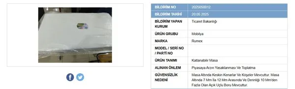 Ayrıca, Rumex markasına ait katlanabilir masa da yasaklanan ürünler arasında yer aldı. Bu ürünün keskin kenar ve köşelere sahip olması ve masa altında 7 ila 12 mm çapında, 10 mm’den derin açık uçlu borular bulunması nedeniyle güvenlik açısından tehlikeli olduğu bildirildi.