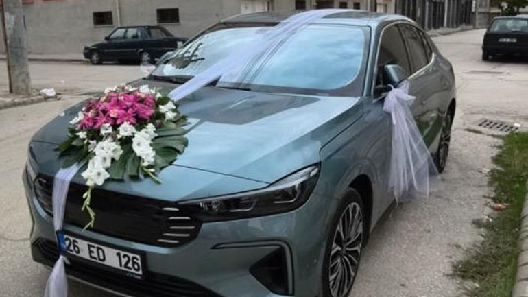 Geleneksel şekilde süslenen yerli otomobil, konvoy sırasında dikkati üzerine çekti. Gelini baba evinden almak için T10F modelini kullanan damat Emre Tuncer, yakınlarının tebriklerini kabul etti.