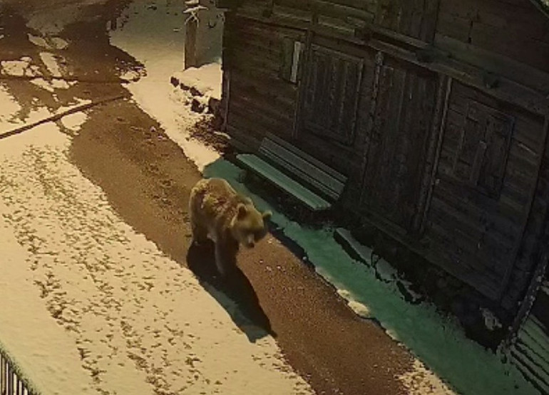 Mahalle aralarında dolaşan ve yayla evine giren ayılar güvenlik kameralarına yansıdı. Görüntülerde; bir ayının pençesiyle yayla evinin kapısını açtığı ve etrafa bakındığı, başka bir ayının ise mahalle aralarında gezindiği görüldü. (DHA)