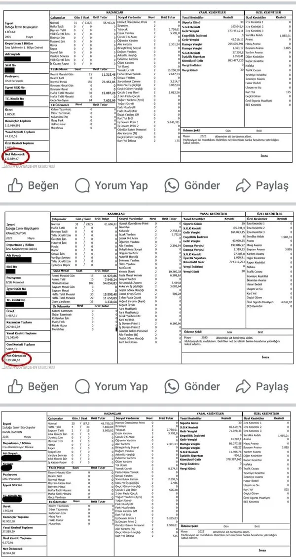 Tugay, akşam saatlerinde İzBB Basın bürosu aracılığıyla İZSU Genel Müdürlüğünde görev yapan iki çalışanın fazla mesai ile şişirilmiş mayıs ayına ait bordrolarını paylaştı. Belediye şirketlerinde yıllık 270 saat fazla mesai sınırlaması olmasına rağmen, paylaşılan birinci bordroda 30 günlük süre içerisinde 213, ikinci bordroda ise 285 saat fazla mesai yapıldığı, bu durumun karşılığında ise işçilerin birine 129, diğerine ise 132 bin lira maaş ödemesi yapıldığı görüldü.